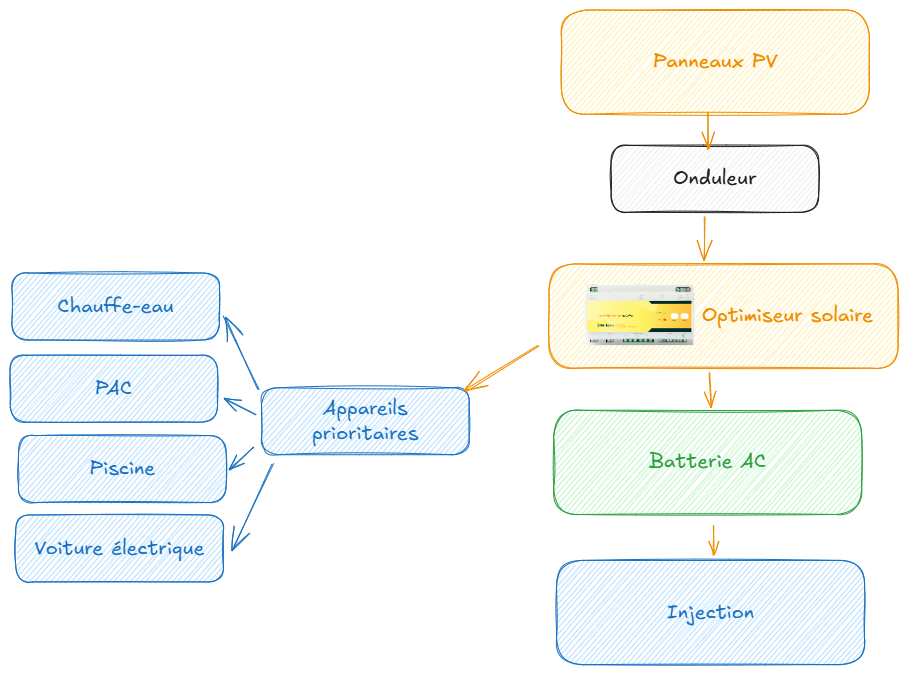 En alimentant directement un appareil depuis l’onduleur PV via l’optimiseur, on évite le passage par la batterie et sa double conversion AC/DC. Cela permet de récupérer jusqu’à 15 % d’énergie en plus.